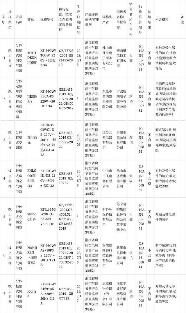 (7批次抽检分比方格空调产品 图片起源:浙江省市场监视打点局网站)